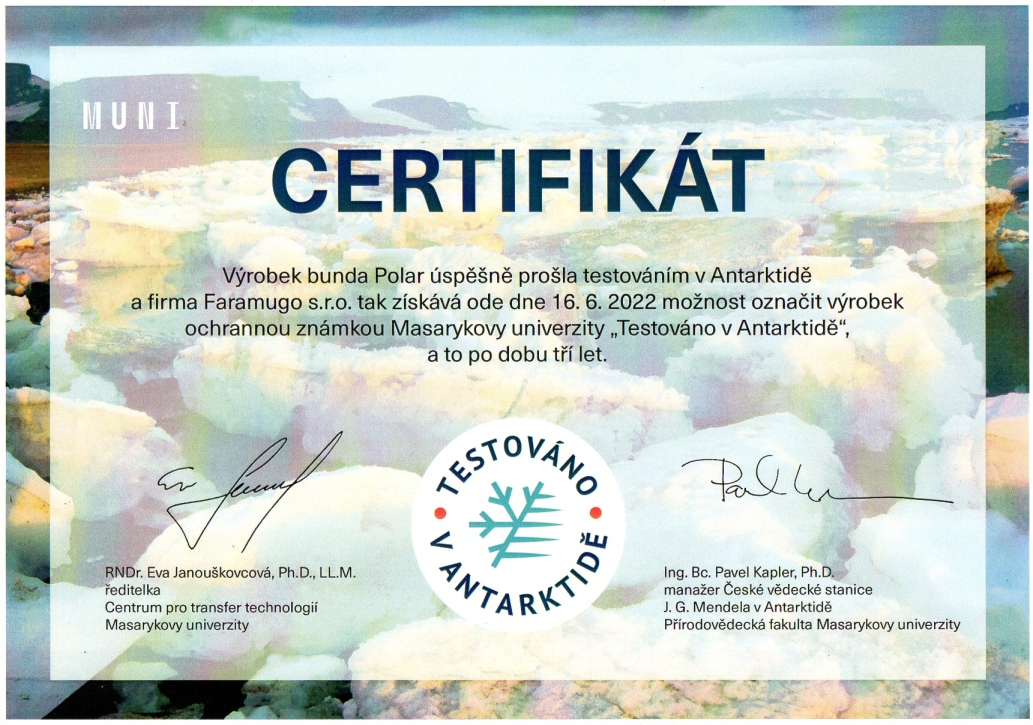 Jackets for many Beskydy, Krkonoše and Jeseníky ski resorts. Jackets and trousers for fishermen. Clothes for Atlantic crossing. Special trousers as part of rehabilitation machines. Jackets for a large North Bohemian construction company. Jackets for power engineers from CEPS. Jackets for the municipal police from Mariánské Lázně. Clothes for polar explorers in Antarctica. We also made a cleverly devised outdoor coat for the filmmakers, standing outside on set in the cold, rain, snow and wind, insulated with faux fleece and with a down removable liner.